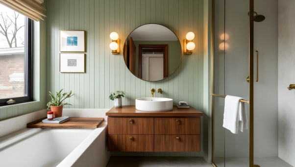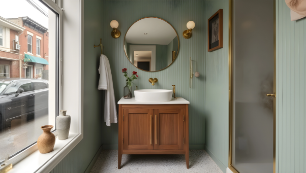 Brass shelves add exquisite and elegant atmosphere to the bedroom, and neutral towels can create a quiet and modern atmosphere in any bathroom. White, beige or gray tones can complement almost any decorative style, making the small space more spacious, and the wooden cabinet adds a sense of texture. On the whole, the walls with green as the main color are elegant and fresh.