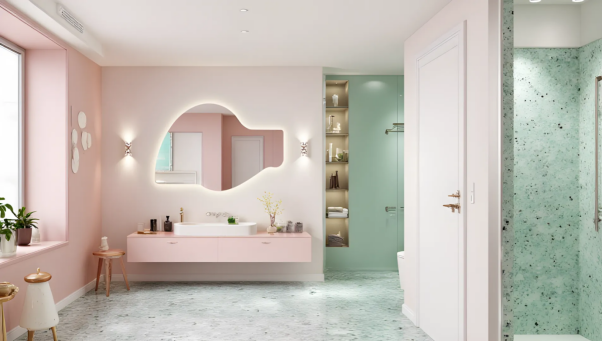 Irregular frame design is very modern, which can not only create a beautiful visual focus, but also maintain the fashion sense of the overall decoration. Soft lighting warms people’s hearts, and with the aromatherapy on the shelf, the aroma of aromatherapy is relaxing, creating a warm feeling, and the pink wall has a romantic feeling, which looks exquisite and warm as a whole.